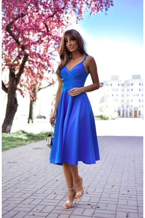 Tyto šaty jsou ve velikosti 38. Šaty jsou krásného jednoduchého střihu v modré barvě a mají tenká dvojitá ramínka. Na prsou jsou šaty střižené do véčka a krásně zdůrazní Váš štíhlý pas. Vzadu jsou šaty na zip a nemají podšívku. Materiál je lehounký a krásně splývavý. Šaty jsou ve velice módní midi délce. Tyto šaty jsou naprosto ideální volbou na svatební a koktejlové večírky! Obvod hrudi je 86cm, obvod pasu je 76cm, obvod boků je 140cm, délka šatů od průramku je 91cm.