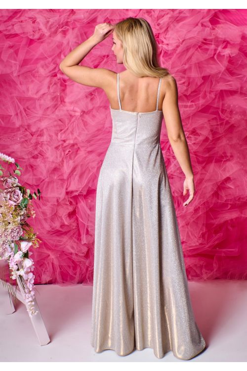 Šaty jsou z třpytivého elastického materiálu. Na prsou jsou stažené, mají tenká jednoduchá ramínka, v pase krásně zdůrazní štíhlý pas. Vzadu jsou na dlouhý zip a jsou bez podšívky. Na předním díle delší rozparek. Materiál je krásně splývavý a lehoučký.