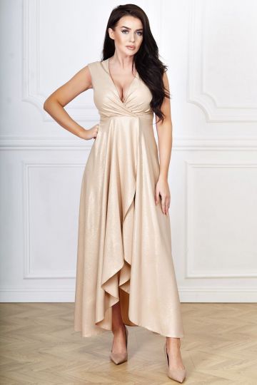 Krásně řešený vrchní díl šatů, na spodní části jsou asymetricky střižené. Šaty mají zlatavou třpytivou barvu a jsou mírně elastické.Šaty jsou vzadu na zip. V těchto šatech budete vypadat vždy stylově při každé společenské události, plesu, svatbě či oslavě.