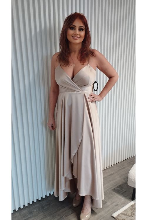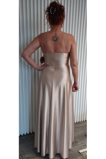 Lesklý saténový materiál, šaty jsou na prsou střižené do véčka, mají tenká špagetová ramínka, v pase krásně zdůrazní štíhlý pas, vzadu jsou na dlouhý zip a jsou bez podšívky. Materiál je splývavý, v pase mají šaty vázačku, na spodní části jsou šaty asymetricky střižené. Tyto šaty jsou naprosto ideální volbou na svatební a koktejlové večírky!