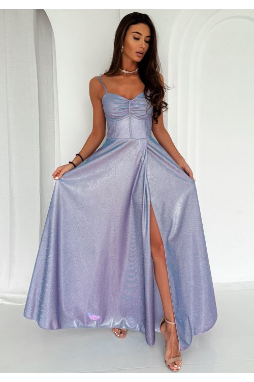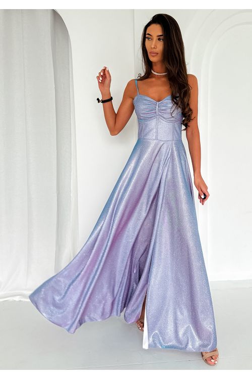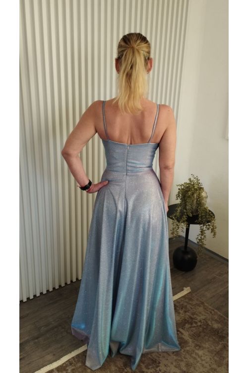Šaty jsou na prsou stažené, mají tenká jednoduchá ramínka, v pase krásně zdůrazní štíhlý pas, vzadu jsou na dlouhý zip a jsou bez podšívky. Šaty jsou z třpytivého elastického materiálu. Na předním díle delší rozparek. Materiál je krásně splývavý a lehoučký. Tyto šaty jsou naprosto ideální volbou na svatební a koktejlové večírky!