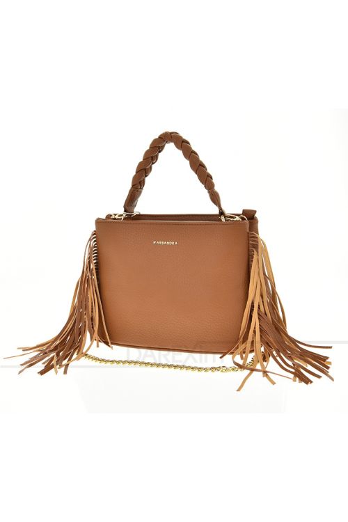 Jedinečný kousek ve dvou barvách tmavě hnědé barvy i v módní velbloudí barvě. Kabelka má jedno širší proplétané ucho na nošení v ruce, po stranách velmi módní třásně, je doplněna i dlouhým zlatým kovovým popruhem - řetízkem , které je možno nosit přes rameno a které si můžete kdykoliv odepnout. Kabelka má dvě velké přihrádky uzavíratelné na zip. Povrch kabelky je z imitace kůže, je lehce omyvatelná.